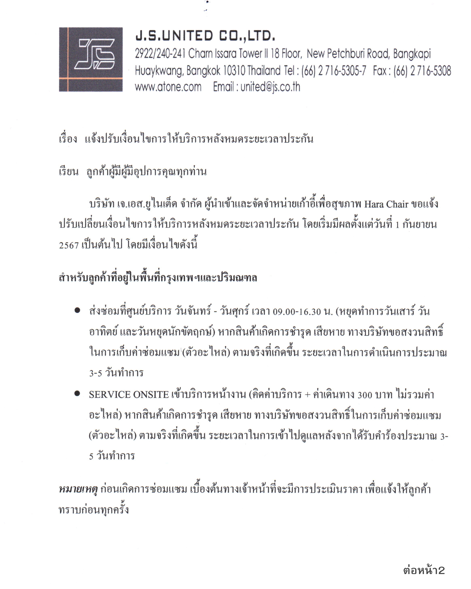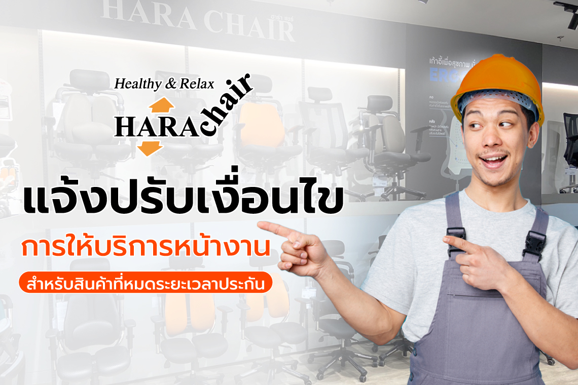 บริษัท เจ.เอส.ยูไนเต็ด จำกัด ผู้นำเข้าและจัดจำหน่ายเก้าอี้เพื่อสุขภาพ Hara Chair ขอแจ้งปรับเปลี่ยนเงื่อนไขการให้บริการหลังหมดระยะเวลาประกัน เริ่มมีผลตั้งแต่วันที่ 1 กันยายน 2567 เป็นต้นไป โดยมีเงื่อนไขดังนี้