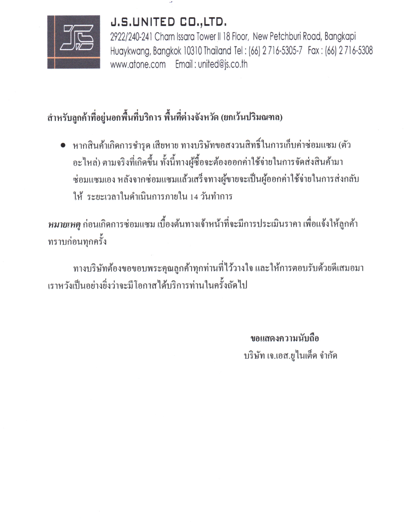 - หากสินค้าเกิดการชำรุด เสียหาย ทางบริษัทขอสงวนสิทธิ์ในการเก็บค่าซ่อมแซม (ตัวอะไหล่) ตามจริงที่เกิดขึ้น ทั้งนี้ทางผู้ซื้อจะต้องออกค่าใช้จ่ายในการจัดส่งสินค้ามาซ่อมแซมเอง หลังจากซ่อมแซมแล้วเสร็จทางผู้ขายจะเป็นผู้ออกค่าใช้จ่ายในการส่งกลับให้ ระยะเวลาในดำเนินการภายใน 14 วันทำการ